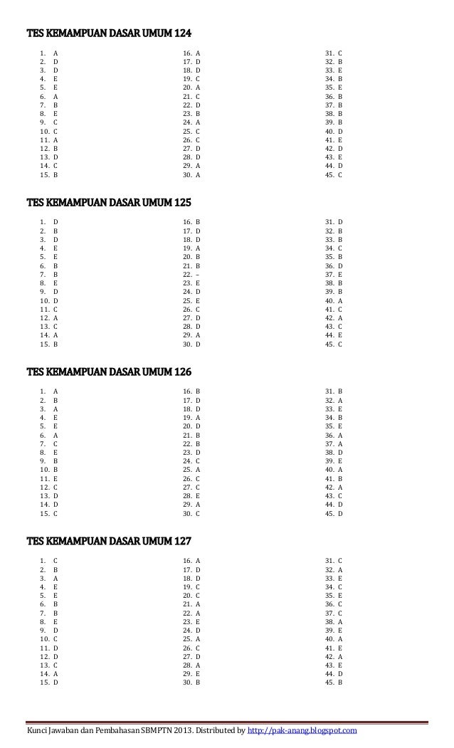 Kunci jawaban semua kode soal sbmptn 2013 kemampuan tpa, tkdu, sainte…