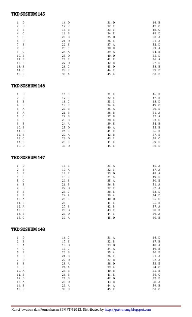 Kunci jawaban semua kode soal sbmptn 2013 kemampuan tpa, tkdu, sainte…